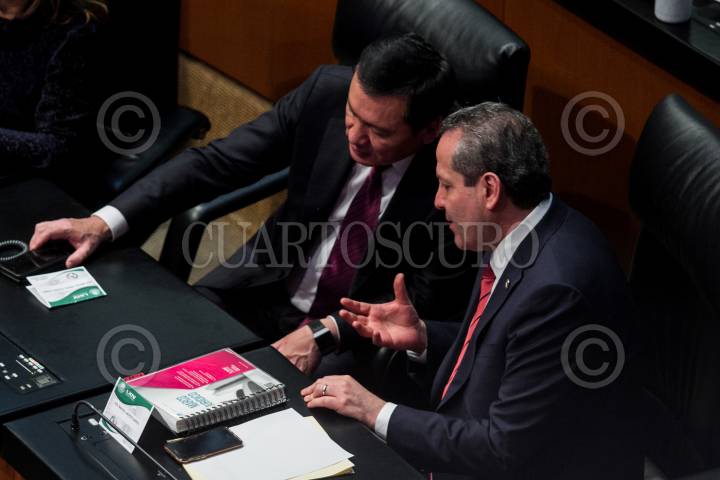 CIUDAD DE MÉXICO, 16ENERO2019.- Miguel Ángel Osorio Chong, senador priista, conversa con su homólogo Eruviel Ávila durante la primer sesión del periodo extraordinario del pleno del Senado de la República. FOTO: GALO CAÑAS /CUARTOSCURO.COM