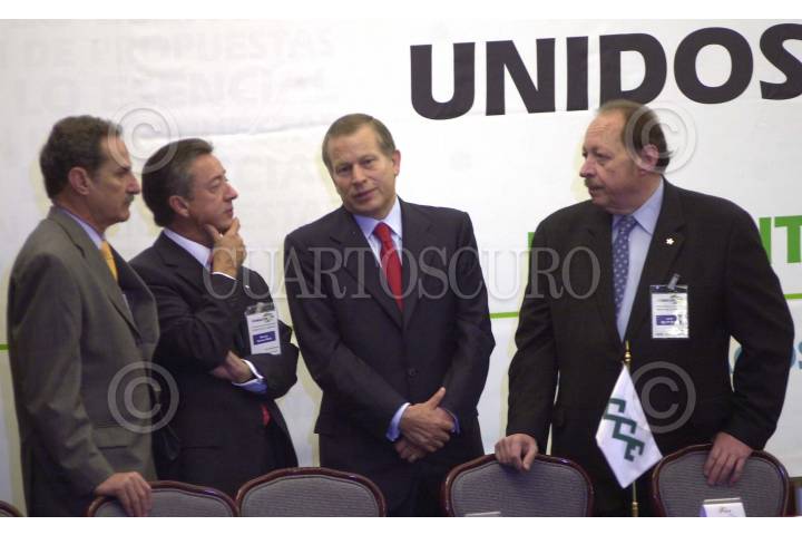 MEXDF28AGO2004.- El diputado del PRI Ernesto Elorduy, Manuel Medina Mora, presidente de la Asociación de Bancos, Manuel Angel Nuñez Soto, gobernador del estado de Hidalgo, y León Halkin, presidente de la Concamin, en la ceremonia de clausura de la Convención Nacional de Contribuyentes. FOTO:Eunice Adorno/CUARTOSCURO.COM