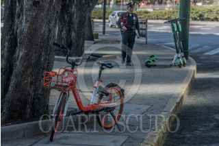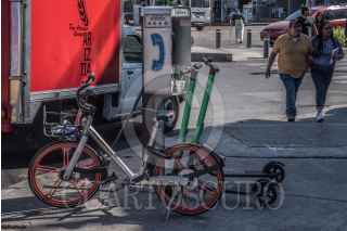 CIUDAD DE MÉXICO, 26ENERO2019.- El servicio de préstamo de bicicletas y patines “scooters” por parte de empresas privadas ha aumentado en los últimos meses en la capital del país, ampliando la oferta de movilidad vial a los capitalinos, pero también ha generado descontento en algunos sectores debido a la obstrucción en las vías públicas que estos servicios pueden ocasionar por la falta de lineamientos que establezcan una forma adecuada de estacionamiento. Recientemente, la alcaldía de Benito Juárez, ha implementado un operativo para rescatar el espacio público de obstrucciones viales. FOTO: MARIO JASSO /CUARTOSCURO.COM