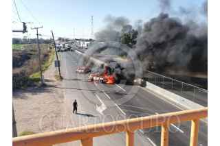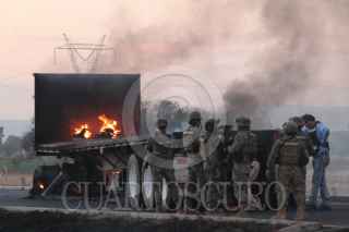 MUNICIPIO DE VILLAGRÁN, GUANAJUATO, 29ENERO2019.- En la carretera que comunica a los municipios de Celaya y Salamanca, se llevaron a cabo bloqueos en respuesta a un operativo realizado por elementos de la Marina, quienes aseguraron pipas en las que se transportaba hidrocarburo del cual no se pudo acreditar la procedencia. Momentos antes, las fuerzas de la Marina y encargados de seguridad física de Pemex realizaron el aseguramiento de un carro tanque que transportaba gasolina en un predio de la comunidad de San Salvador Torrecillas. Esto generó una manifestación de inconformidad por parte de los vecinos de la zona, quienes de acuerdo con algunas versiones, comenzaron a quemar la maleza, con la finalidad de que las autoridades federales se retiraron del lugar, para después cerrar la carretera con vehículos y prenderles fuego. FOTO: BETO ARIAS /CUARTOSCURO.COM