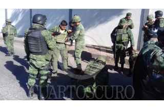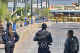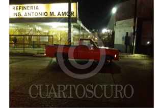 SALAMANCA, GUANAJUATO, 31ENERO2019.- Una camioneta de color naranja con un supuesto artefacto explosivo fue localizada en una de las puertas de la refinería "Antonio M. Amor" de Pemex, en otro punto fueron halladas mantas firmadas por el cártel de Santa Rosa de Lima en donde supuestamente amenazan al Presidente de México, Andrés Manuel López Obrador, esto por los operativos que ha lanzado en el estado para combatir el robo de gasolina. Elementos del Ejercito Mexicano montaron un operativo especial para retirar la unidad, más tarde se confirmó que la supuesta bomba no representaba ningún peligro, sin embargo se monto un operativo especial de vigilancia en torno a la refinería. FOTO: BETO ARIAS /CUARTOSCURO.COM