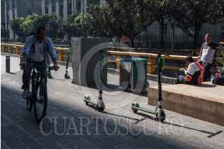 CIUDAD DE MÉXICO, 05FEBRERO2019.- En las últimas semanas el servicio de préstamo de bicicletas y patines “scooters” por parte de empresas privadas, ha generado descontento en algunos sectores debido a la obstrucción en las vías públicas que estos servicios pueden ocasionar por la falta de lineamientos que establezcan una forma adecuada de estacionamiento, y sobre el servicio póliza de seguros contra accidentes y responsabilidad civil. El pasado de 3 de febrero durante la madrugada, un usuario de scooter perdió la vida, después de ser atropellado por un taxi sobre la avenida Chapultepec. FOTO: MARIO JASSO /CUARTOSCURO.COM