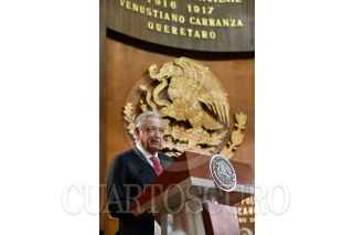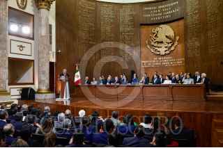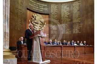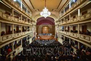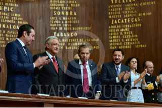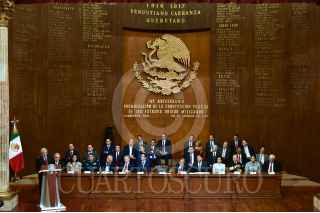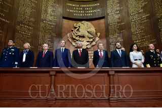 QUERÉTARO, QUERÉTARO, 05FEBRERO2019.- El Presidente de México Andrés Manuel López Obrador, encabezó la ceremonia de aniversario de la Conmemoración de la Promulgación de la Constitución de 1917, realizada en el Teatro de la República, de esta entidad. En la imagen lo acompañan el gobernador de la entidad, Francisco Domínguez Servién; Porfirio Muñoz Ledo, presidente de la Cámara de Diputados; Martí Batres, presidente del Senado de la República, Luisa María Alcalde Luján, secretaria del Trabajo, y José Rafael Ojeda Durán, secretario de la Marina. FOTO: GOBIERNO DE LA REPÚBLICA /CUARTOSCURO.COM