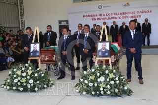 MORELIA, MICHOACÁN, 06FEBRERRO2019. Familiares, amigos, compañeros de trabajo y autoridades de la PGJE dieron el último adiós a Carlos Augusto Hernández y Luis Enrique Hinojosa, agentes de la Policía Ministerial, adscritos al área de homicidios quienes murieron al ser emboscados en el municipio de Ario de Rosales el pasado día lunes. El evento se llevó a cabo en el área de hangares de la Procuraduría General de Justicia del Estado (PGJE), acto solemne en el que se dieron cita familiares, amigos, compañeros de trabajo y autoridades de la dependencia. FOTO: JUAN JOSÉ ESTRADA SERAFÍN /CUARTOSCURO.COM