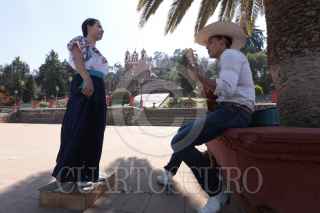 METEPEC, ESTADO DE MÉXICO, 06FEBRERO2019.- Dos estudiantes de la escuela de Bellas Artes de Toluca practican en la explanada de la iglesia del Calvario en Metepec Son Jarocho y zapateado. FOTO: ARTEMIO GUERRA BAZ / CUARTOSCURO.COM
