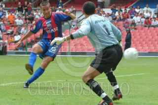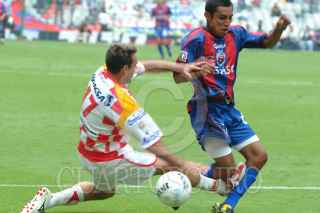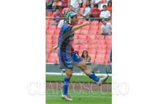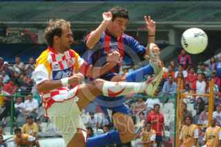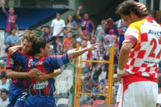 MEXICO, D.F. 29AGOSTO2004.- El atlantista Sebastián Gonzalez "Chamagol" festeja el cuarto tanto a favor de su equipo mientras uan Carlos Leaño (tecos) se lamenta de ello en el partido de la jornada 3 del torneo de apertura 2004 en el que Atlante venció 4 goles a cero a los Tecos de la U. de G. FOTO: Iván Stephens/CUARTOSCURO.COM