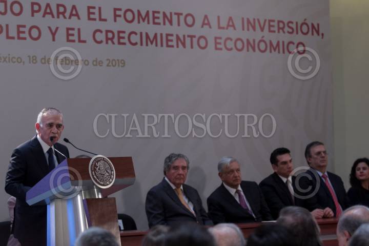 CIUDAD DE MÉXICO, 18FEBRERO2019.- Carlos Slim Helú, empresario mexicano, y Carlos Aceves del Olmo, dirigente nacional de la Confederación de Trabajadores de México (CTM), durante la instalación del consejo para el Fomento a la Inversión, el empleo y Crecimiento Económico, en el salón Tesorería del Palacio Nacional. FOTO: GALO CAÑAS /CUARTOSCURO.COM