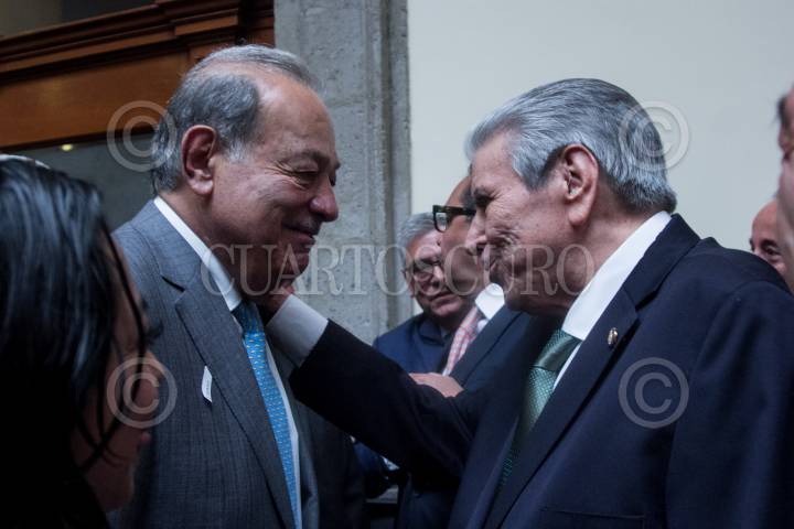 CIUDAD DE MÉXICO, 18FEBRERO2019.- Carlos Slim Helú, empresario mexicano, y Carlos Aceves del Olmo, dirigente nacional de la Confederación de Trabajadores de México (CTM), durante la instalación del consejo para el Fomento a la Inversión, el empleo y Crecimiento Económico, en el salón Tesorería del Palacio Nacional. FOTO: GALO CAÑAS /CUARTOSCURO.COM