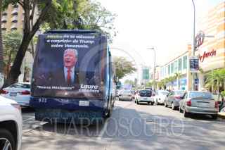 ACAPULCO, GUERRERO, 18FEBRERO2019.- Camiones del trasporte urbano circulan con propaganda con la imagen de Donal Trump, presidente de Estados Unidos, y la posición de México ante la situación de Venezuela. FOTO: BERNANDINO HERNÁNDEZ /CUARTOSCURO.COM