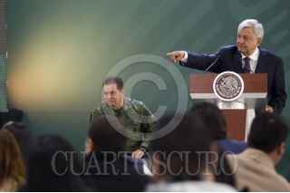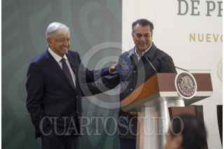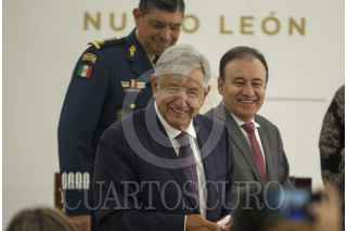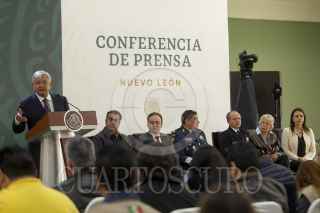 APODACA, NUEVO LEÓN, 20FEBRERO2019.- El Presidente Andrés Manuel López Obrador, acudió a las instalaciones de la Séptima Zona Militar, 4ta. Región Militar en Nuevo León, donde encabezó una reunión de seguridad con el Secretario de la Defensa Nacional; Luis Cresencio González, la Secretaria de Gobernación; Olga Sánchez Cordero, el gobernador de Nuevo León; Jaime Rodríguez y la Alcaldesa del municipio de Escobedo, Nuevo León; Clara Luz Flores previo a la conferencia de prensa. FOTO: GABRIELA PÉREZ MONTIEL /CUARTOSCURO.COM