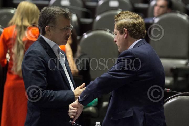 CIUDAD DE MÉXICO, 21FEBRERO2019.- Tonatiuh Bravo, coordinador de Movimiento Ciudadano, y Juan Carlos Romero Hicks, coordinador panista en diputados, durante la sesión ordinaria del palacio legislativo de San Lázaro. FOTO: GALO CAÑAS /CUARTOSCURO.COM