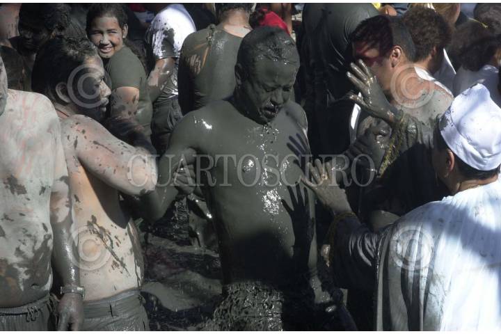 MINA, NUEVO LEON17OCTUBRE.2004.- Bajo la sombra de un pirul, precisamente en el chaquito donde el ñiño Fidencio curaba a personas de bajos recursos hasta 1938, fecha en que murió de cansancio, este hombre se baña en el lodo con la esperanza de sanar su males, igual que decenas de seguidores de Fidencio procedentes del país de EEUU. FOTO:PEDRO VALTIERRA/CUARTOSCURO.COM