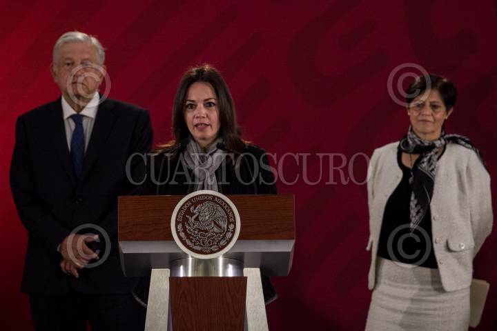 CIUDAD DE MÉXICO, 22FEBRERO2019.- Andrés Manuel López Obrador, presidente de México, y Frédéric Vacheron, representante de la UNESCO, durante la conferencia matutina donde firmó un acuerdo en conjunto con la Organización de las Naciones Unidas para la Educación, la Ciencia y la Cultura (UNESCO) y la Organización de las Naciones Unidas (ONU) para realizar pruebas que constaten que el proyecto de la termoeléctrica no afectará el agua de los estados. Asimismo, el jefe del ejecutivo anunció que se realizará una segunda subasta de vehículos de lujo para juntar fondos para la Guardia Nacional. FOTO: GALO CAÑAS /CUARTOSCURO.COM