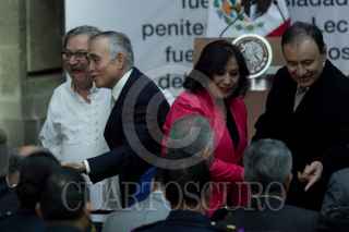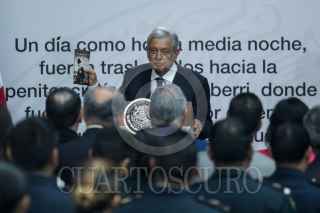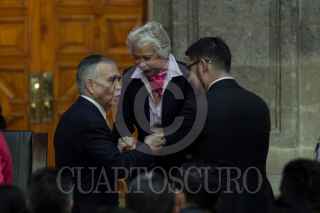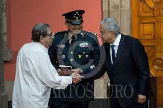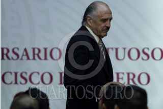 CIUDAD DE MÉXICO, 22FEBRERO2019.- Paco Ignacio Taibo II, director general del Fondo de Cultura Económica, Luis Cresencio Sandoval, secretario de la Defensa Nacional, Andrés Manuel López Obrador, presidente de México, y Beatriz Gutiérrez Müller, titular del Consejo Asesor Honorario de la Coordinación Nacional Memoria Histórica y Cultural, durante la ceremonia del CVI aniversario luctuoso de Francisco I. Madero en Palacio Nacional. FOTO: GALO CAÑAS /CUARTOSCURO.COM