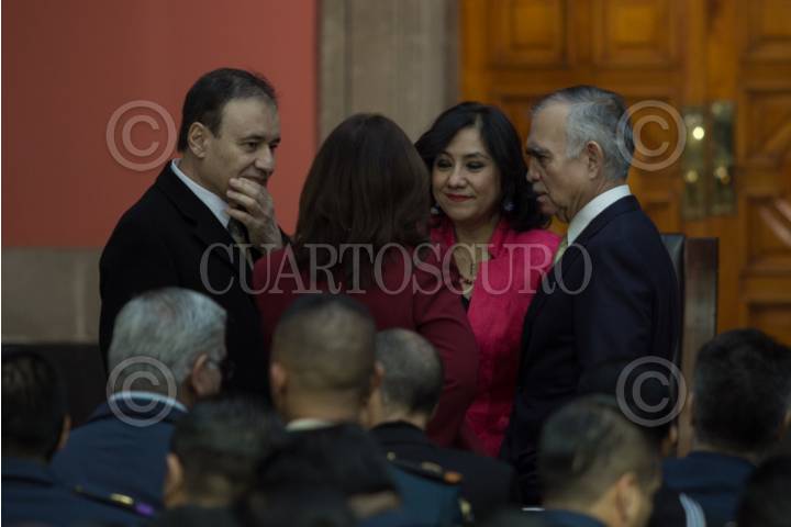CIUDAD DE MÉXICO, 22FEBRERO2019.- Paco Ignacio Taibo II, director general del Fondo de Cultura Económica, Luis Cresencio Sandoval, secretario de la Defensa Nacional, Andrés Manuel López Obrador, presidente de México, y Beatriz Gutiérrez Müller, titular del Consejo Asesor Honorario de la Coordinación Nacional Memoria Histórica y Cultural, durante la ceremonia del CVI aniversario luctuoso de Francisco I. Madero en Palacio Nacional. FOTO: GALO CAÑAS /CUARTOSCURO.COM