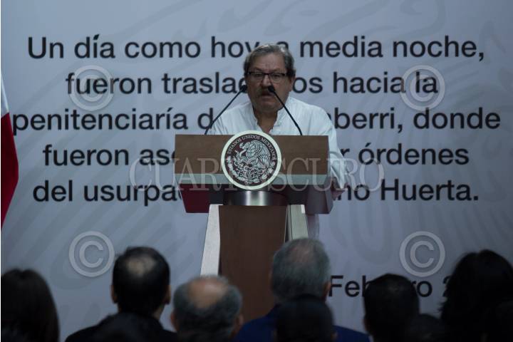 CIUDAD DE MÉXICO, 22FEBRERO2019.- Paco Ignacio Taibo II, director general del Fondo de Cultura Económica, Luis Cresencio Sandoval, secretario de la Defensa Nacional, Andrés Manuel López Obrador, presidente de México, y Beatriz Gutiérrez Müller, titular del Consejo Asesor Honorario de la Coordinación Nacional Memoria Histórica y Cultural, durante la ceremonia del CVI aniversario luctuoso de Francisco I. Madero en Palacio Nacional. FOTO: GALO CAÑAS /CUARTOSCURO.COM