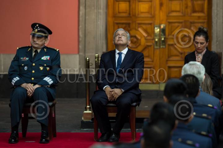 CIUDAD DE MÉXICO, 22FEBRERO2019.- Paco Ignacio Taibo II, director general del Fondo de Cultura Económica, Luis Cresencio Sandoval, secretario de la Defensa Nacional, Andrés Manuel López Obrador, presidente de México, y Beatriz Gutiérrez Müller, titular del Consejo Asesor Honorario de la Coordinación Nacional Memoria Histórica y Cultural, durante la ceremonia del CVI aniversario luctuoso de Francisco I. Madero en Palacio Nacional. FOTO: GALO CAÑAS /CUARTOSCURO.COM