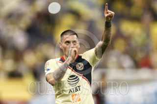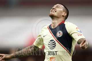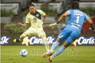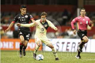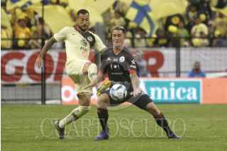 CIUDAD DE MÉXICO, 23FEBRERO2019.- Con dos tantos de Nicolás Castillo y otro más de Henry Martin, las Águilas del América ganaron 3-0 a Lobos BUAP, en partido de la jornada 8, del Clausura 2019, disputado en el Azteca. En la imagen, Leonardo Ramos, delantero de Lobos pelea el balón ante la defensa de americanista. FOTO: ISAAC ESQUIVEL /CUARTOSCURO.COM