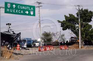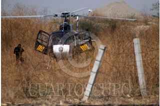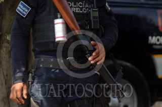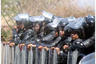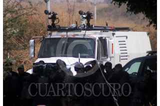 YECAPIXTLA, MORELOS, 24FEBRERO2019.-Policias con equipo antimotines de la Comisión Estatal de Seguridad se apostan en un terreno en la entrada a la comunidad de Huexca. Además, se pudo observar una tanqueta con dos torretas que lanzan agua y el helicóptero. La medida presuntamente tiene como fin detener a los opositores de la comunidad de Amilcingo en caso de que se acerquen a otros municipios y protesten en las mesas receptoras de voto en la consulta que impulsa el gobierno federal para el funcionamiento de la termoeléctrica de Huexca. FOTO: MARGARITO PÉREZ RETANA /CUARTOSCURO.COM