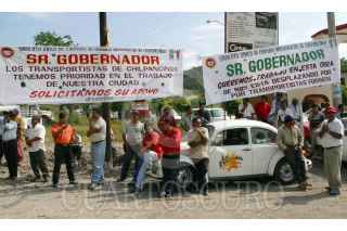 Chilpancingo, Guerrero, 18OCTUBRE2004.- Integrantes del Sindicato Unico de Choferes Materialistas de Chilpancingo, protestaron con mantas en el evento oficial del banderazo de salida a los trabajos de construccion del boulevar Chilpancingo-Petaquillas. Foto: Oscar Alvarado/CUARTOSCURO.COM