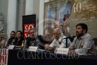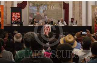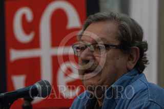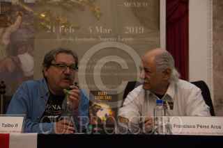 CIUDAD DE MÉXICO, 28FEBRERO2019.- Paco Taibo II, gerente editorial encargado de la Dirección del Fondo de Cultura Económica (FCE), presentó junto con los escritores Francisco Pérez Arce y Luis Arturo Salmeron, los más recientes proyectos editoriales del FCE, esto como parte de las actividades de la FIL palacio de Minería en su edición 40. FOTO: ANDREA MURCIA /CUARTOSCURO.COM