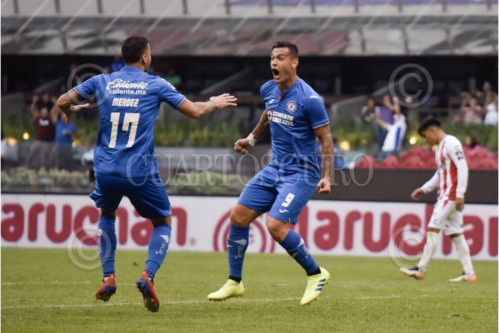 CIUDAD DE MÉXICO, 02MARZO2019.- La Máquina del Cruz Azul remontó en el marcador para llevarse la victoria 2 a 1 frente a los Rayos del Nexaca, como parte de la jornada 9 del Torneo Clausura 2019 de la Liga MX. En la imagen, Edgar Méndez celebra su anotación junto a Roberto Alvarado. FOTO: MARIO JASSO /CUARTOSCURO.COM