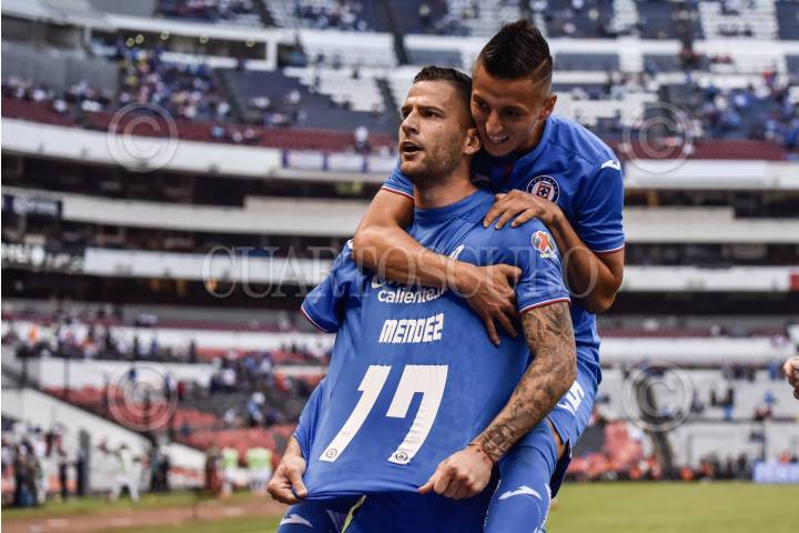 CIUDAD DE MÉXICO, 02MARZO2019.- La Máquina del Cruz Azul remontó en el marcador para llevarse la victoria 2 a 1 frente a los Rayos del Nexaca, como parte de la jornada 9 del Torneo Clausura 2019 de la Liga MX. En la imagen, Edgar Méndez celebra su anotación junto a Roberto Alvarado. FOTO: MARIO JASSO /CUARTOSCURO.COM