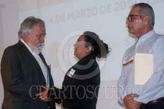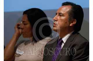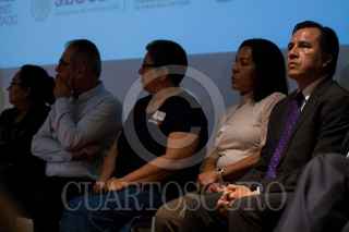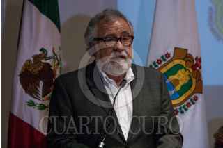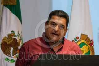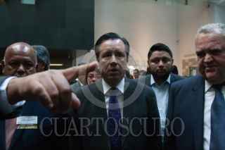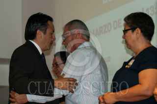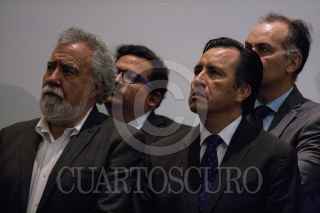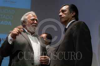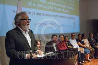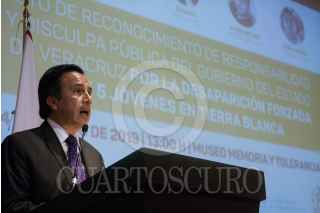 CIUDAD DE MÉXICO, 04MARZO2019.- Alejandro Encinas, subsecretario de Derechos Humanos de la SEGOB, y Cuitláhuac García, gobernador del estado de Veracruz, durante el acto de reconocimiento de responsabilidad y disculpa pública del gobierno del estado de Veracruz, por la desaparición forzada de José Alfredo González Díaz, Mario Arturo Orozco Sánchez, Susana Tapia Garibo, José Benítez de la O y Bernardo Benítez Arróniz, en el Museo de Memoria y Tolerancia. FOTO: GALO CAÑAS /CUARTOSCURO.COM