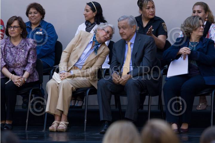 CIUDAD DE MÉXICO, 08MARZO2019.- Olga Sánchez Cordero, secretaría de Gobernación, y Andrés Manuel López Obrador, presidente de México, encabezaron el evento “mujeres construyendo el futuro” como parte de la conmemoración del Día Internacional de la Mujer. En la imagen, un grupo de mujeres protesta durante el discurso del presidente. FOTO: GALO CAÑAS /CUARTOSCURO.COM