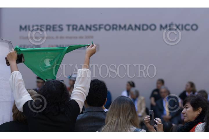 CIUDAD DE MÉXICO, 08MARZO2019.- Olga Sánchez Cordero, secretaría de Gobernación, y Andrés Manuel López Obrador, presidente de México, encabezaron el evento “mujeres construyendo el futuro” como parte de la conmemoración del Día Internacional de la Mujer. En la imagen, un grupo de mujeres protesta durante el discurso del presidente. FOTO: GALO CAÑAS /CUARTOSCURO.COM