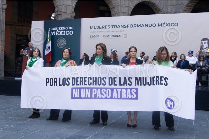 CIUDAD DE MÉXICO, 08MARZO2019.- Olga Sánchez Cordero, secretaría de Gobernación, y Andrés Manuel López Obrador, presidente de México, encabezaron el evento “mujeres construyendo el futuro” como parte de la conmemoración del Día Internacional de la Mujer. En la imagen, un grupo de mujeres protesta durante el discurso del presidente. FOTO: GALO CAÑAS /CUARTOSCURO.COM