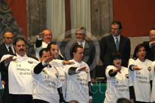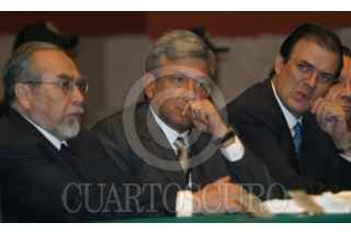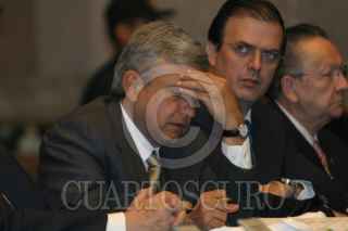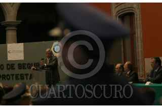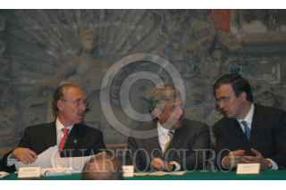 MEXICO, D.F. 02DICIEMBRE2004.- Fernando Shütte, integrante del Consejo Ciudadano de Seguridad Pública , Andrés Manuel López Obrador, jefe de gobierno de la ciudad de México y Marcelo Ebrard, secretario de seguridad pública del D.F. durante la ceremonia de toma de protesta del Consejo Ciudadano de Seguridad Pública del Distrito Federal. FOTO: Nely Salas/CUARTOSCURO.COM