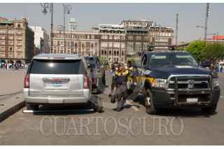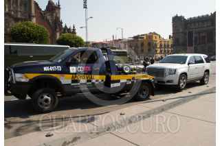 CIUDAD DE MÉXICO, 11MARZO2019.- Policías viales remolcaron una camioneta con placas del estado de Durango que se encontraba mal estacionada frente a la plancha del Zócalo. Esto ocurrió mientras el presidente Andrés Manuel López Obrador rendía el informe a cien días de estar al frente del poder ejecutivo. FOTO: ROGELIO MORALES /CUARTOSCURO.COM