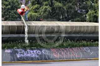 CIUDAD DE MÉXICO, 16MARZO2019.- Un trabajador borra la pintas que realizaron mujeres en la glorieta de la Diana Cazadora el pasado 8 de Marzo, por la manifestación del Día Internacional de la Mujer. FOTO: RODRIGO RUBIO /CUARTOSCURO.COM