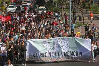 GUADALAJARA, JALISCO, 19MARZO2019.- Alrededor de 200 estudiantes del Centro Artes Audio Visuales (CAAV), marcharon de las instalaciones de ya mencionado centro estudiantil hacia la Glorieta de los Niños Héroes o recién nombrada de los Desaparecidos, esto para exigir el esclarecimiento de los hechos en torno a la desaparición o muerte de los 3 estudiantes de cine desaparecidos hace un año en el municipio de Tonalá. FOTO: FERNANDO CARRANZA GARCIA / CUARTOSCURO.COM