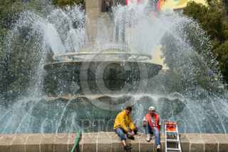 CIUDAD DE MÉXICO, 21MARZO2019.- Trabajadores encargados de la limpieza, descansan bajo los rayos del sol de primavera, mientras a sus espaldas se reactiva la fuente. FOTO: ROGELIO MORALES /CUARTOSCURO.COM