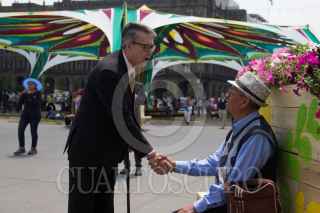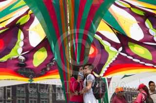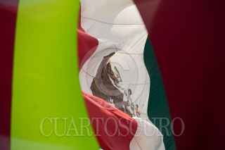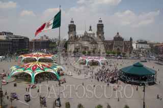CIUDAD DE MÉXICO, 21MARZO2019.- La bandera del asta de la plancha del Zócalo Capitalino vista a través de la recién inaugurada instalación del kiosko y el Jardín Cultural de Primavera, con la finalidad de una apropiación del espacio público más importante de la Ciudad. FOTO: GRACIELA LÓPEZ /CUARTOSCURO.COM