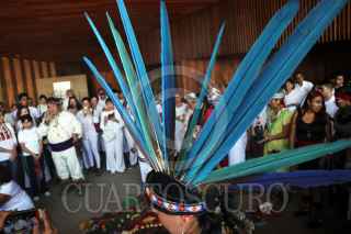 CUERNAVACA, MORELOS, 21MARZO2019.- El penacho de una mujer danzante durante la celebración por la entrada de la primavera en el auditorio Teopanzolco, a lado de la zona arqueológica del mismo nombre que se encuentra cerrada desde el 19 de septiembre del 201 7, cuando fue dañada por el sismo. FOTO: MARGARITO PÉREZ RETANA /CUARTOSCURO.COM