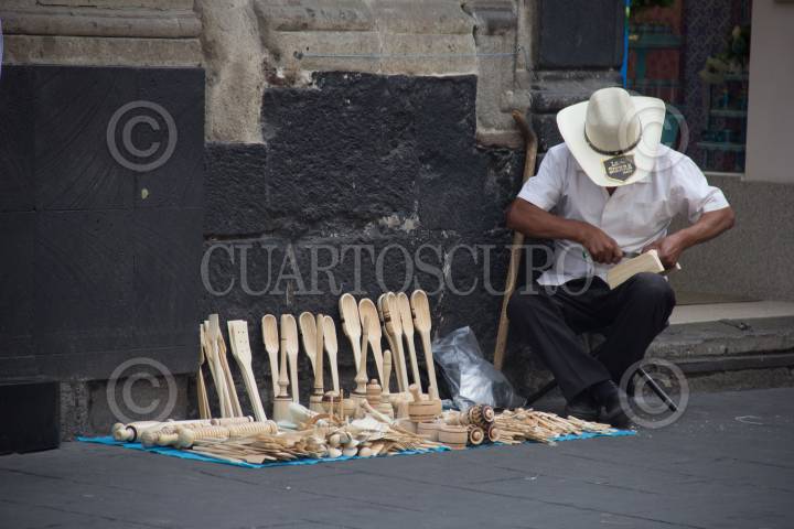 CIUDAD DE MÉXICO, 22MARZO2019.- En las calles del Centro Histórico, un señor corta un rayador, mientras vende cubiertos para la cocina hechos de madera. FOTO: GRACIELA LÓPEZ /CUARTOSCURO.COM