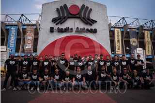 CIUDAD DE MÉXICO, 30MARZO2019.- Integrantes de la barra "Libres y Locos", la cual apoya al equipo de los Tigres de la UANL, antes de entrar al Estadio Azteca, se toman una fotografía en un monumento ubicado a las afueras del inmueble. FOTO: PEDRO ANZA /CUARTOSCURO.COM