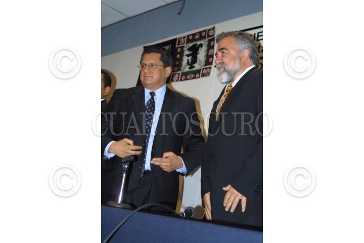 MEXICO, D.F. 13DICIEMBRE2004.- Gabriel Regino, subsecretario de seguridad pública, Joel Ortega Cuevas nuevo secretario de Seguridad Pública del Distrito Federal y Alejandro Encinas, secretario de Gobierno del D. F., durante la toma de posesión de Ortega en el auditorio del edificio de la SSP. FOTO:CUARTOSCURO.COM