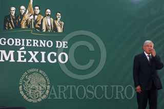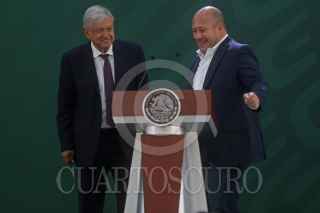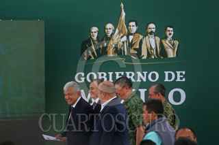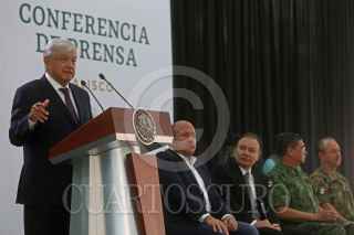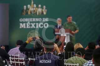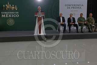 ZAPOPAN, JALISCO, 05ABRIL2019.- Andrés Manuel López Obrador Presidente de la Republica en compañía de Alfonso Durazo Secretario de Seguridad Publica de la Federación, Enrique Alfaro Ramírez Gobernador del estado de Jalisco y autoridades militares, encabezaron una conferencia de prensa matutina para hablar sobre la reunión de seguridad previa, las obras de la línea 3 del Tren Eléctrico Urbano entre otros, dicho compromiso se llevo a cabo el as Instalaciones del Colegio del Aire de la Base Aérea en la Quinta Región Militar. FOTO: FERNANDO CARRANZA GARCIA / CUARTOSCURO.COM