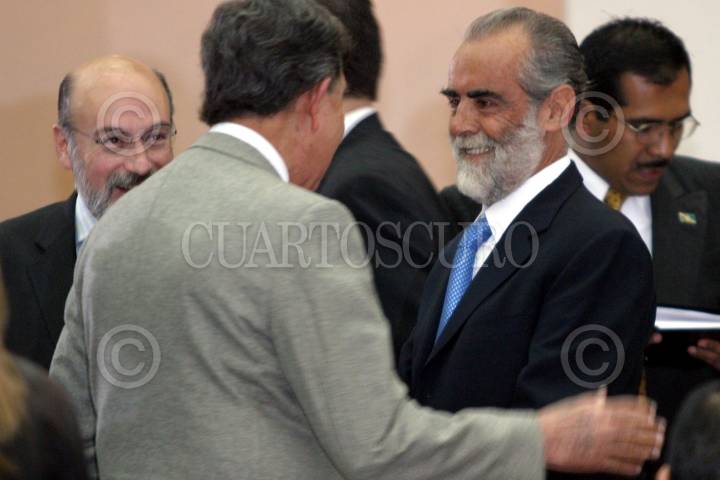 MEXICO, D.F. 24ENERO2005.- El perredista, Cuauhtémoc Cárdenas observa la despedida del gobernador de Michoacán, Lazaro Cárdenas Batel y el senador panista Carlos Medina Plascencia, al término de la reunión de la Asociación Nacional para la Reforma del Estado. FOTO: Sandra Perdomo/CUARTOSCURO.COM