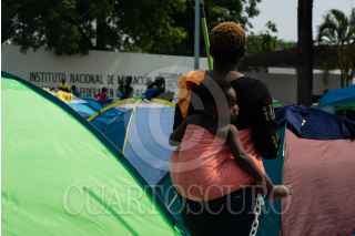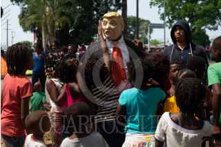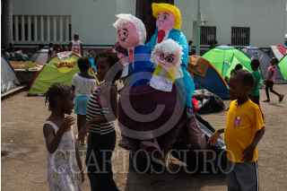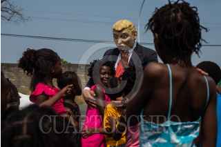 TAPACHULA, CHIAPAS, 06ABRIL2019.- Integrantes del Albergue Todo por ellos A. C., encabezados por el padre Ramón Verdugo realizaron una protesta en las inmediaciones de la Estación Migratoria Siglo XXI, en contra de las deportaciones de migrantes que se han hecho los últimos días. Durante la protesta se quemo una piñata con la forma de los presidentes Donald Trump, Andrés Manuel López Obrador y la secretaria de gobierno Olga Sánchez Cordero. FOTO: ISABEL MATEOS /CUARTOSCURO.COM