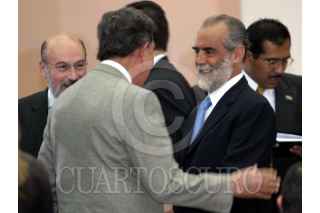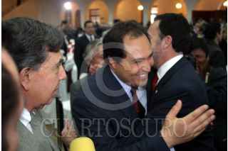 MEXICO, D.F. 24ENERO2005.- El perredista, Cuauhtémoc Cárdenas observa la despedida del gobernador de Michoacán, Lazaro Cárdenas Batel y el senador panista Carlos Medina Plascencia, al término de la reunión de la Asociación Nacional para la Reforma del Estado. FOTO: Sandra Perdomo/CUARTOSCURO.COM