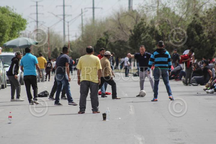 CIUDAD JUÁREZ, 06ABRIL2019.- La taquilla del estadio Olímpico Bénito Juárez, abrió a las 12:00 horas, sin embargo, los usuarios esperaron ya en la línea para comprar los boletos del próximo enfrentamiento del FC Juárez. Los primeros aficionados llegaron desde la 1:00 de la mañana y permanecieron listos para asegurar su lugar en el partido de los Bravos, en la final de la Copa Mx. Familias completas llegaron al Estadio, con sillas, alimentos y bebidas para hacer más ligera la espera. Tanto la afición de los Bravos como del América están a la espera de comprar sus entradas, y algunos aprovecharon para disputar una "cascarita" sobre la avenida. FOTO: NACHO RUÍZ /CUARTOSCURO.COM