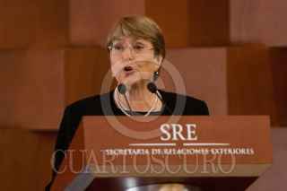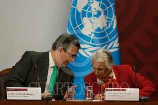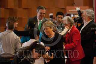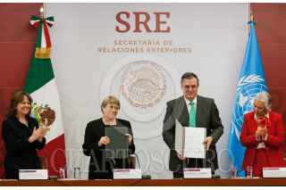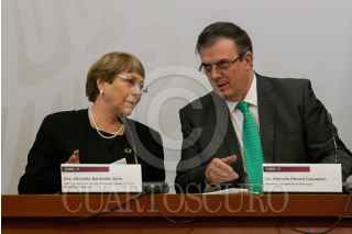 CIUDAD DE MÉXICO, 08ABRIL2019.- Michelle Bachelet, alta comisionada para los Derechos Humanos de la ONU, y Marcelo Ebrard, secretario de Relaciones Exteriores, durante la firma del acuerdo de Asesoría y Asistencia Técnica para la Comisión de la Verdad del caso Ayotzinapa. FOTO: GALO CAÑAS /CUARTOSCURO.COM