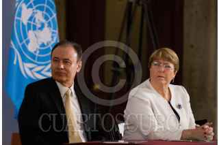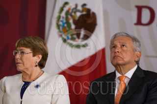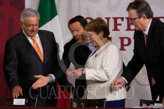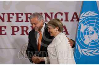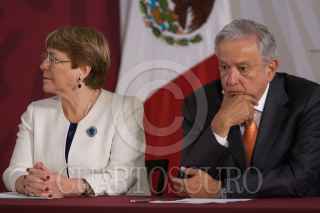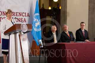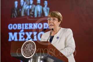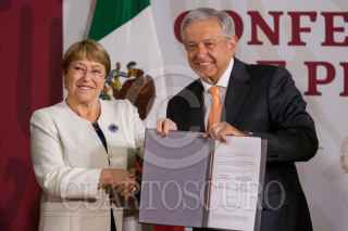 CIUDAD DE MÉXICO, 09ABRIL2019.- Alfonso Durazo, secretario de Seguridad y Protección Ciudadana, y Michelle Bachelet, alta comisionada para los Derechos Humanos de las Naciones Unidas, durante la firma de acuerdo para la prevalencia de los Derechos Humanos en la creación y actuar de la Guardia Nacional. FOTO: GALO CAÑAS /CUARTOSCURO.COM