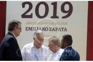 CUERNAVACA, MORELOS, 10ABRIL2019.- Andrés Manuel López Obrador, presidente de la Republica, acompañado del gobernador del estado, Cuauhtémoc Blanco Bravo, los gabinetes estatal y federal, así como diputados locales y federales, además de senadores conmemoro en esta ciudad el Centenario Luctuoso del General Emiliano Zapata Salazar. En la imagen, Marcelo Ebrard, secretario de Relaciones Exteriores, el director de la Compañía Federal de Electricidad, Manuel Bartlett y el diputado federal Porfirio Muñoz Ledo. FOTO: MARGARITO PÉREZ RETANA /CUARTOSCURO.COM