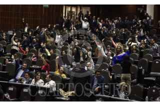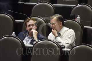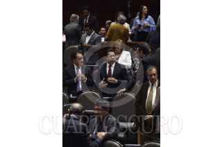CIUDAD DE MÉXICO, 11ABRIL2019.- Con 417 votos a favor, 29 abstenciones y 1 en contra se aprobó en lo general y en lo particular la iniciativa de la reforma de Proyecto de Decreto por el que se reforman, adicionan y derogan diversas disposiciones de las Leyes Federal del Trabajo, Orgánica del Poder Judicial de la Federación, Federal de la Defensoría Pública, del Instituto del Fondo Nacional de la Vivienda para los Trabajadores, y del Seguro Social, en materia de justicia laboral, libertad sindical y negociación colectiva. En la imagen, Itzcóatl Tonatiuh Bravo Padilla, coordinador de Movimiento Ciudadano, junto a Juan Carlos Romero Hicks coordinador del PAN. FOTO: MARIO JASSO /CUARTOSCURO.COM